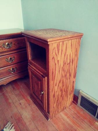 Very solid oak wood cabinet - perfect as a plant stand, phone stand, end table, entertainment center, etc. - has beautiful wood grain in it - some pictures make it look red, but it is more brown than redish - clearing out parent's estate - non-smoking/non-pet home - measures 28 inches tall x 15 inches wide x 12 1/4 inches deep
